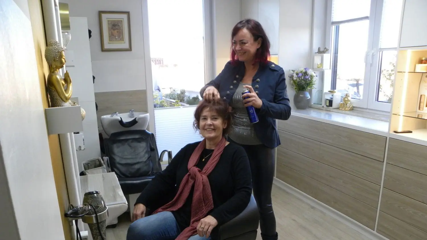 Mandy Sprejz, Kandidatin der Sendung First Dates Hotel auf Vox, in ihrem Friseursalon in Cottbus mit ihrer Freundin Sylvia Michelchen.