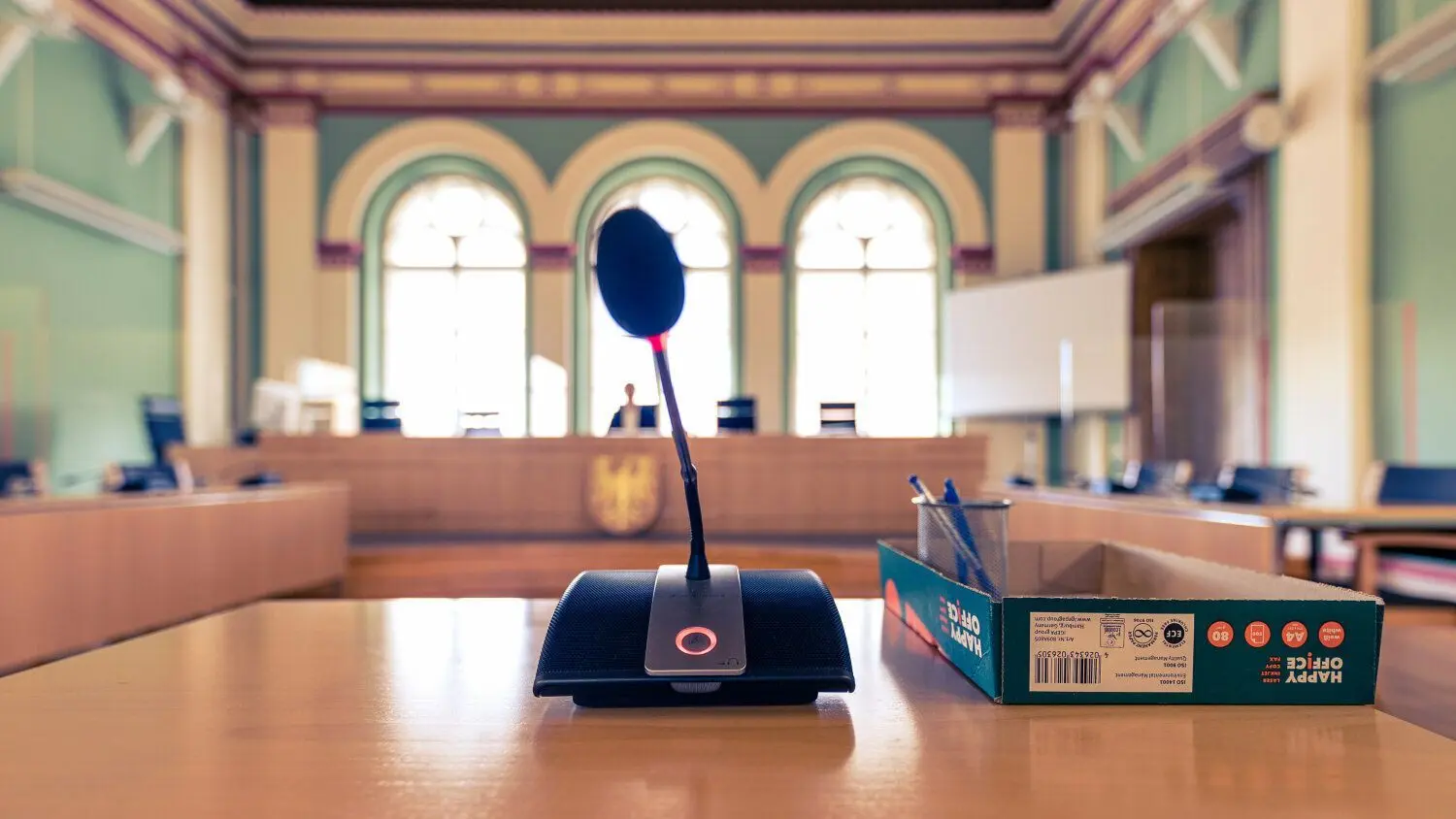 Blick vom Zeugenplatz in den Großen Sitzungssaal des Landgerichts Cottbus. Hier sitzt die Frau, die im November 2021 in Neu-Schmellwitz mit dem Messer angegriffen wurde und erzählt ihre Version der Ereignisse.