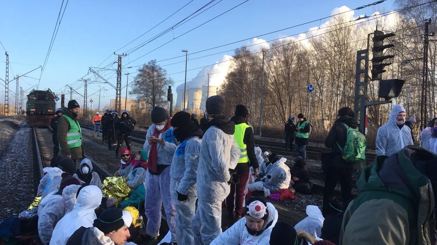 Auf den Gleisen südlich von Teichland, auf der Kohlenbahn-Strecke, sitzen etwa 200 Protestierende in weißen Anzügen. Der Kohlezug wurde gestoppt