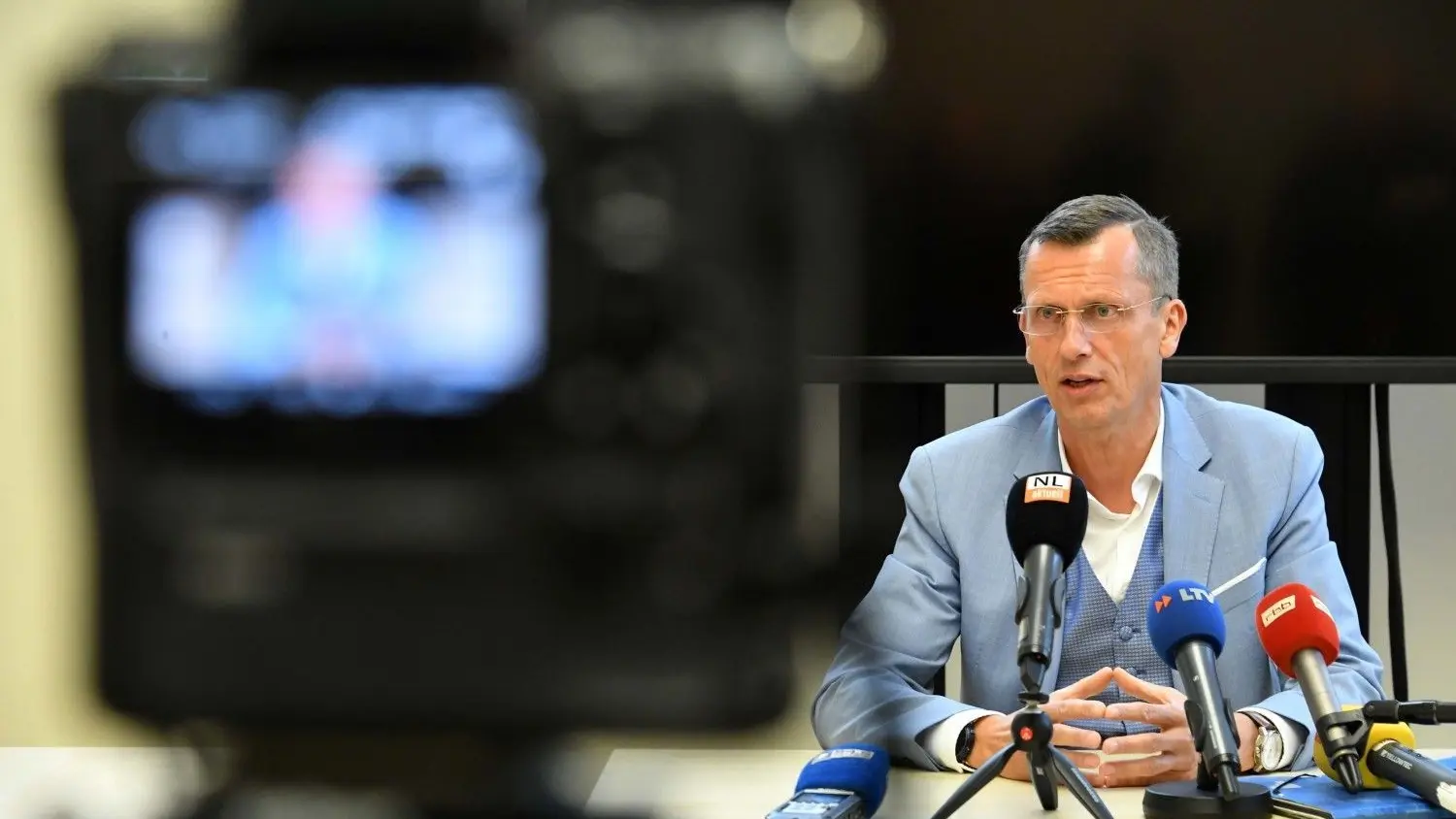 Der Cottbuser Oberbürgermeister Holger Kelch erklärt vor der Presse seinen Verzicht auf eine weitere Amtszeit.