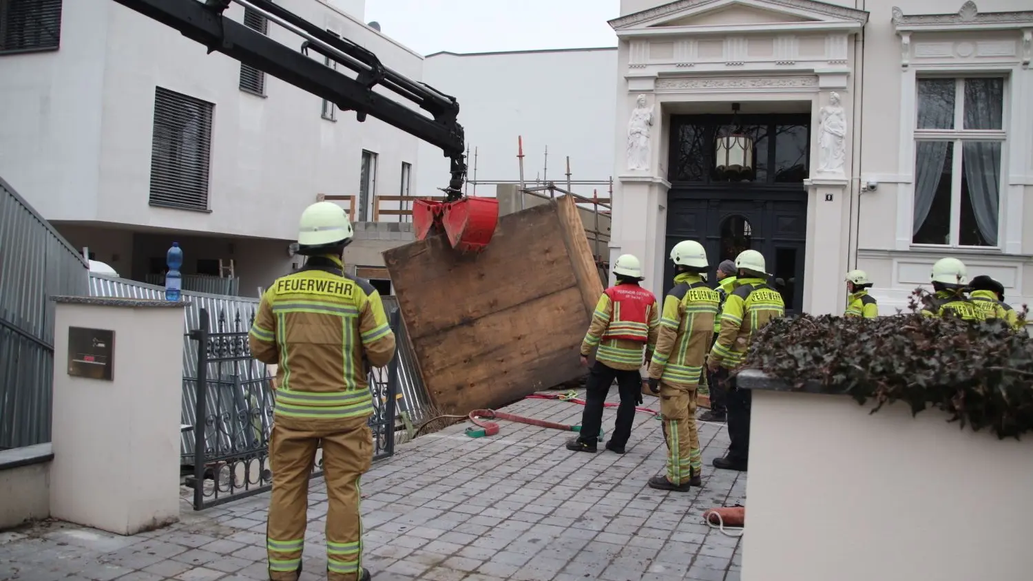 Bei Schachtarbeiten ist am Mittwoch (22. Februar 2023) ein Bauarbeiter in der Cottbuser Puschkinpromenade schwer verletzt worden. Die Berufsfeuerwehr eilte mit einem Kran zur Hilfe, um den Arbeiter zu retten.