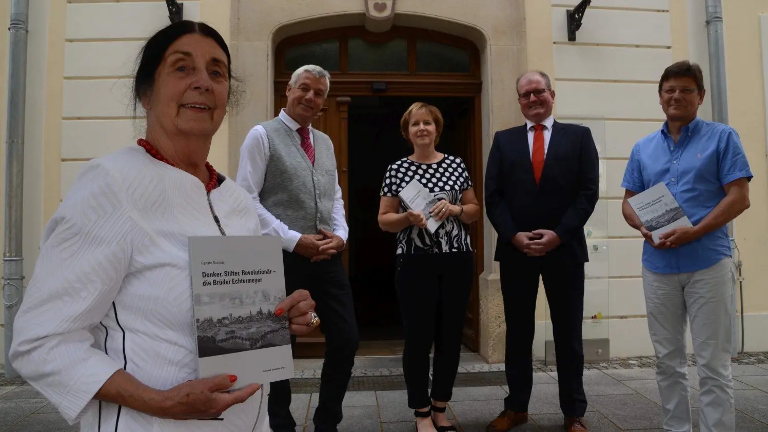 Renate Sachse präsentiert ihr Buch über die Brüder Echtermeyer. Im Hintergrund Vertreter der Sponsoren, die das Erscheinen ermöglichten: Für die Stadt Bad Liebenwerda Thomas Richter, Beigeordneter der Verbandsgemeinde, für die Dr.-Wolfgang-Liebe-Stiftung Dr. Sabine Krauße, Thomas Hettwer für die Sparkassenstiftung „Zukunft Elbe-Elster-Land“ und Kulturamtsleiter Andreas Pöschl für den Landkreis Elbe-Elster.