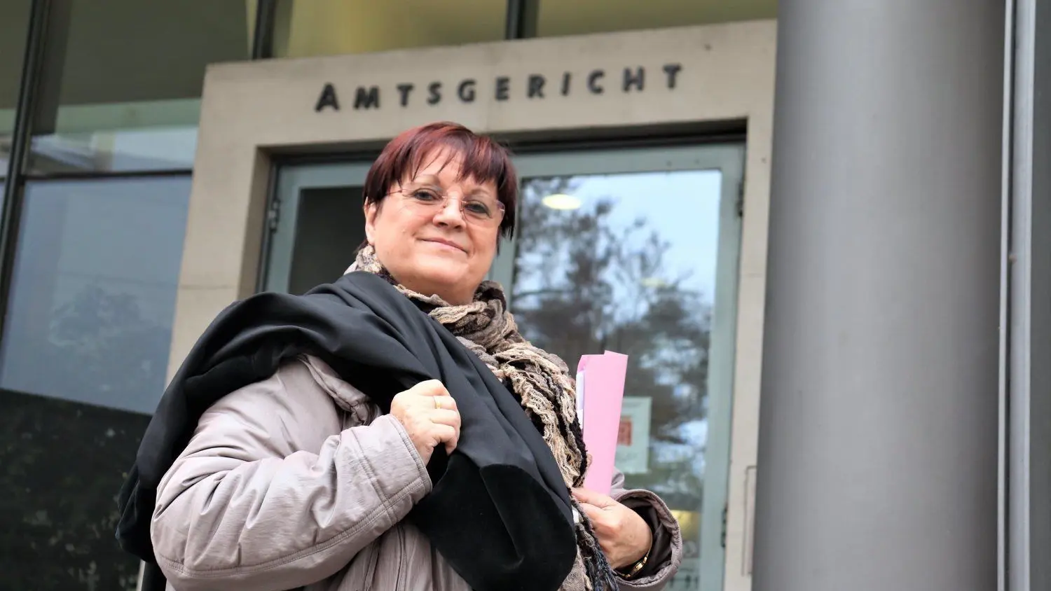 Ihre Robe über der Schulter und die symbolische letzte bearbeitete Akte in der Hand: Richterin Marion Seidel verabschiedet sich nach einem langen Arbeitsleben in der Justiz in den Ruhestand.