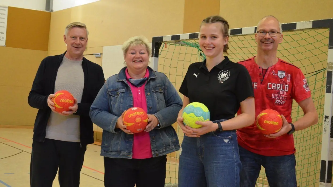 Vanessa Huth (2.v.r.) ist 2021 Vize-Europameisterin mit der U17 des Deutschen Handball-Bundes geworden. Sie ist Schülerin des Foucault-Gymnasiums. Einen Anteil an ihrem Erfolg haben auch Schulleiter Uwe Blazejczyk (l.), SC-Trainerin Kerstin Herzer und Vater Mirko Huth.