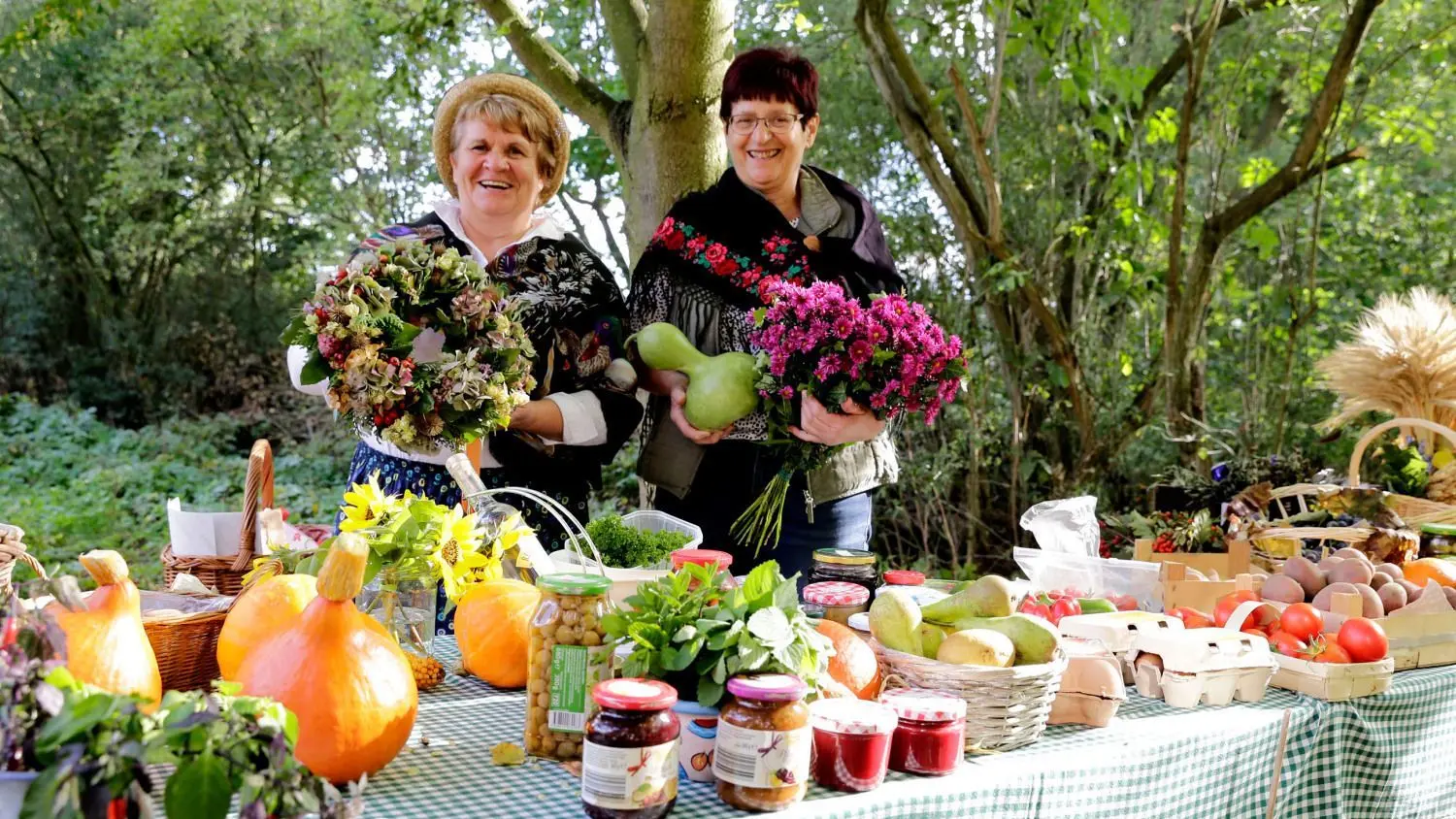 Reich gedeckt hatten Zieckaus Einwohner den Tisch der Erntegaben auf dem Kirchhof, den Silwia Köckritz und Gisela Schulze (v.l.) betreuten.