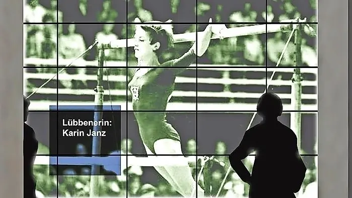So könnte die Monitorwand für Lübbener Persönlichkeiten aussehen hier am Beispiel der Turnerin Karin Janz.
