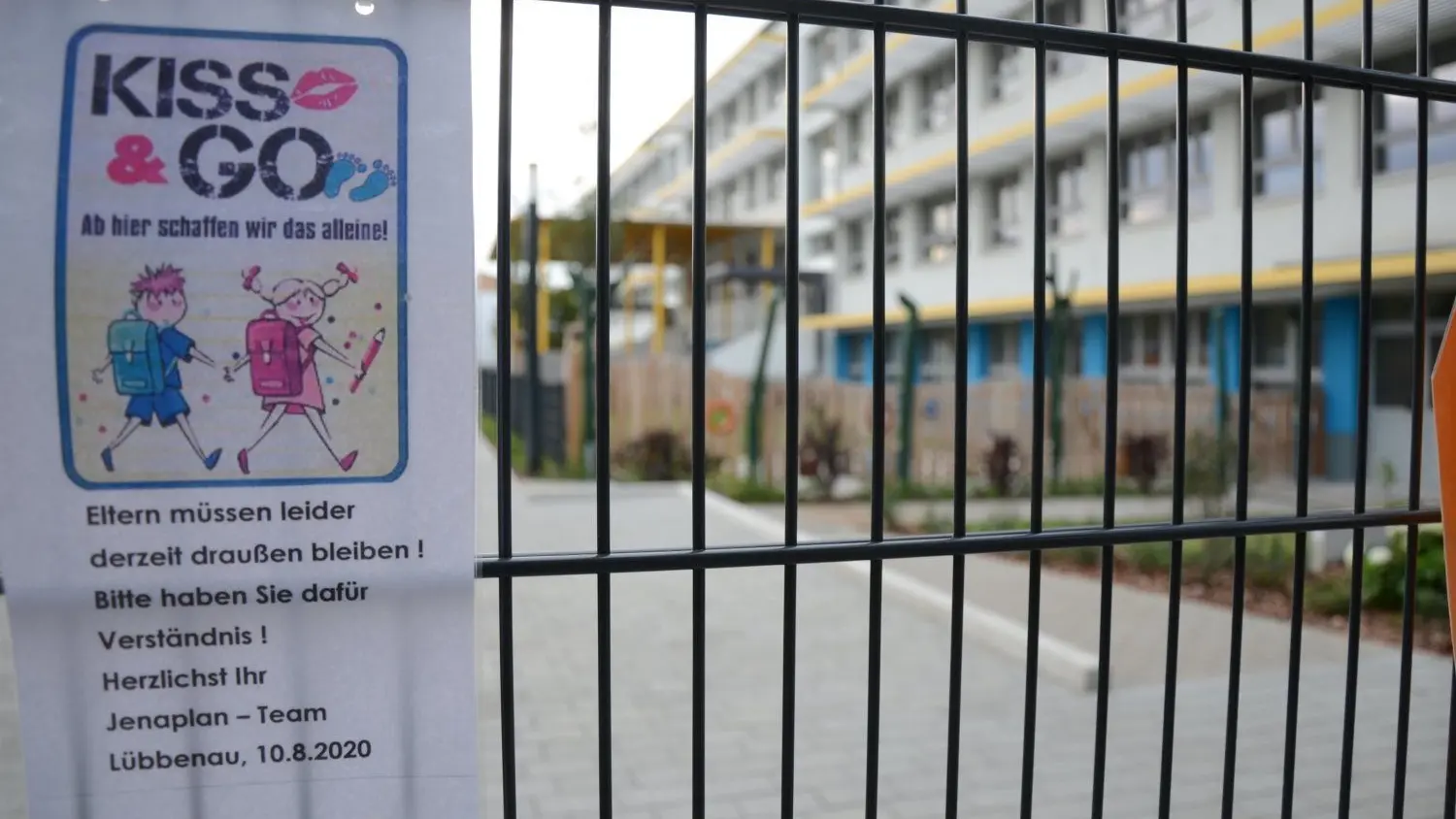 Freundlicher Hinweis für Eltern am Eingangsbereich der Grundschule Jenaplanhaus in der Lübbenauer Neustadt.