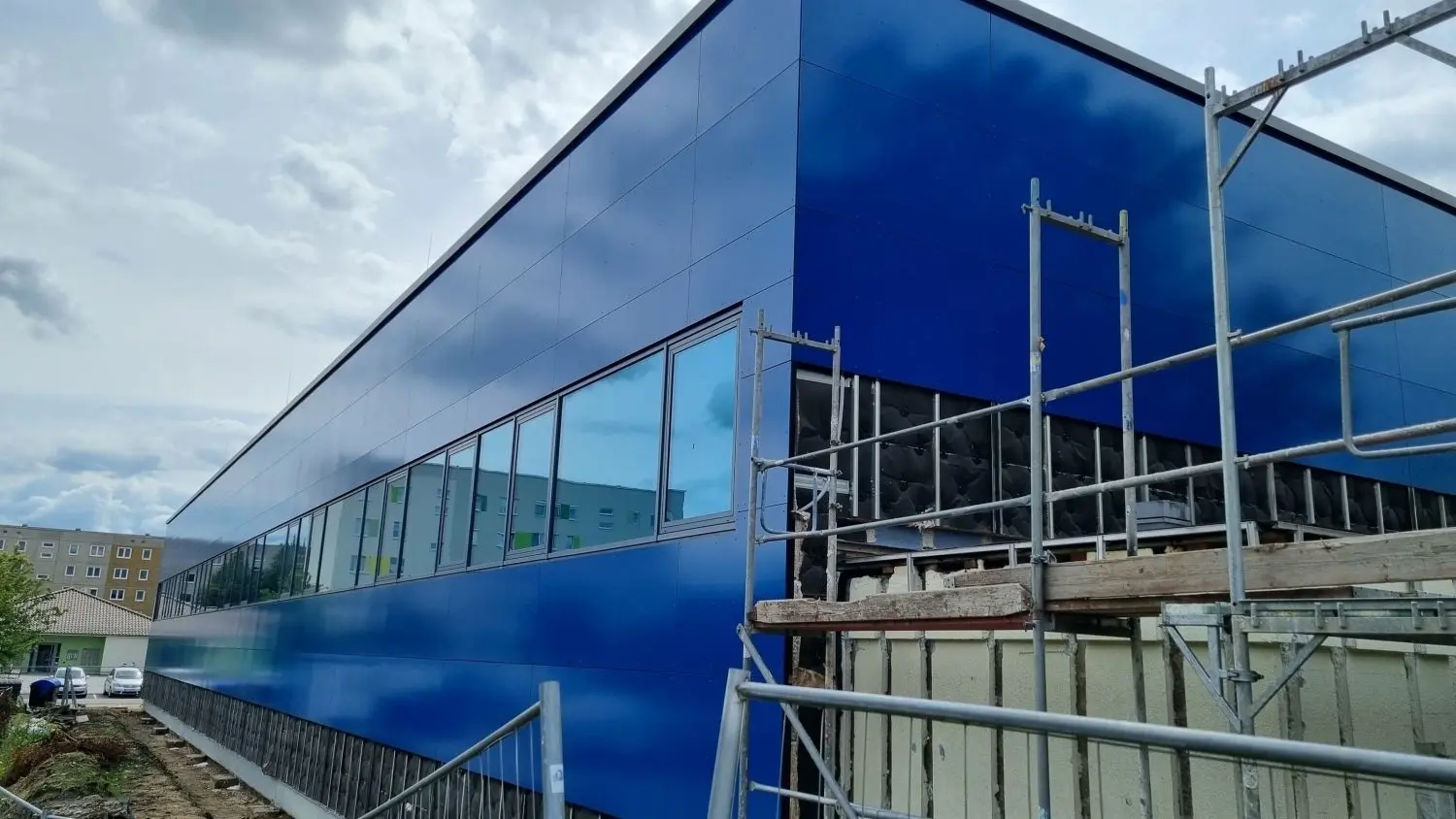 Die Dreifelderhalle in der Neustadt von Lübbenau bleibt nicht mehr lange eine Dauerbaustelle. Die neue Fassade bringt nach der Sanierung Farbe ins Neustadtquartier.