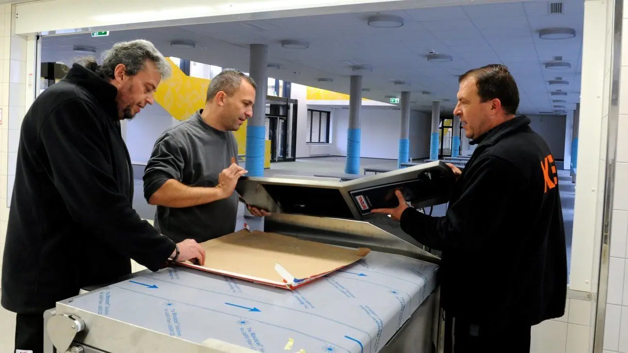 Frank Krause, Frank Ebersbach und Ronny Knebel von KEP, einem Großküchenproduzenten aus Dresden bauen die Küche im neuen Schulkomplex auf. Im Hintergrund sieht man die Aula.